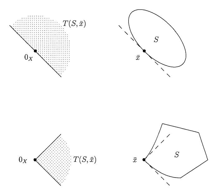 Note: when the set \(S\) is non-convex, \(T_S(\overline{x})\) may not contain \(S\). See the following figure: